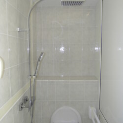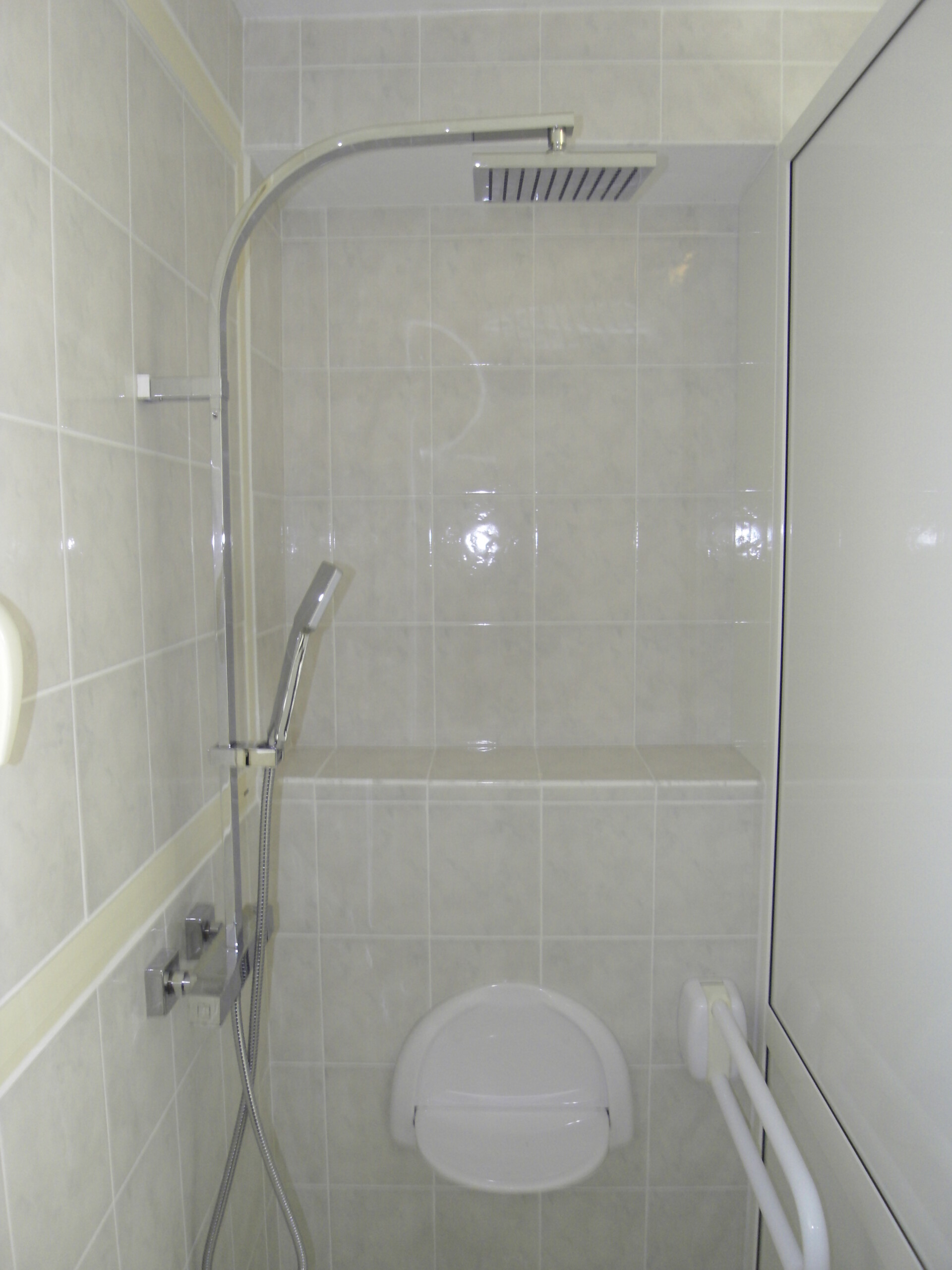 Salle de bain accessible fauteuil douche italienne avec banc relevable et bras de force, Sèche cheveux.