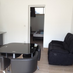 il comprend une cuisine équipée, four encastré, four micro onde, plaque induction, hotte aspirante, lave vaisselle, frigo + congélateur, 1 table + 4 chaises ..un coin salon avec canapé relax, téléviseur, table de salon.
