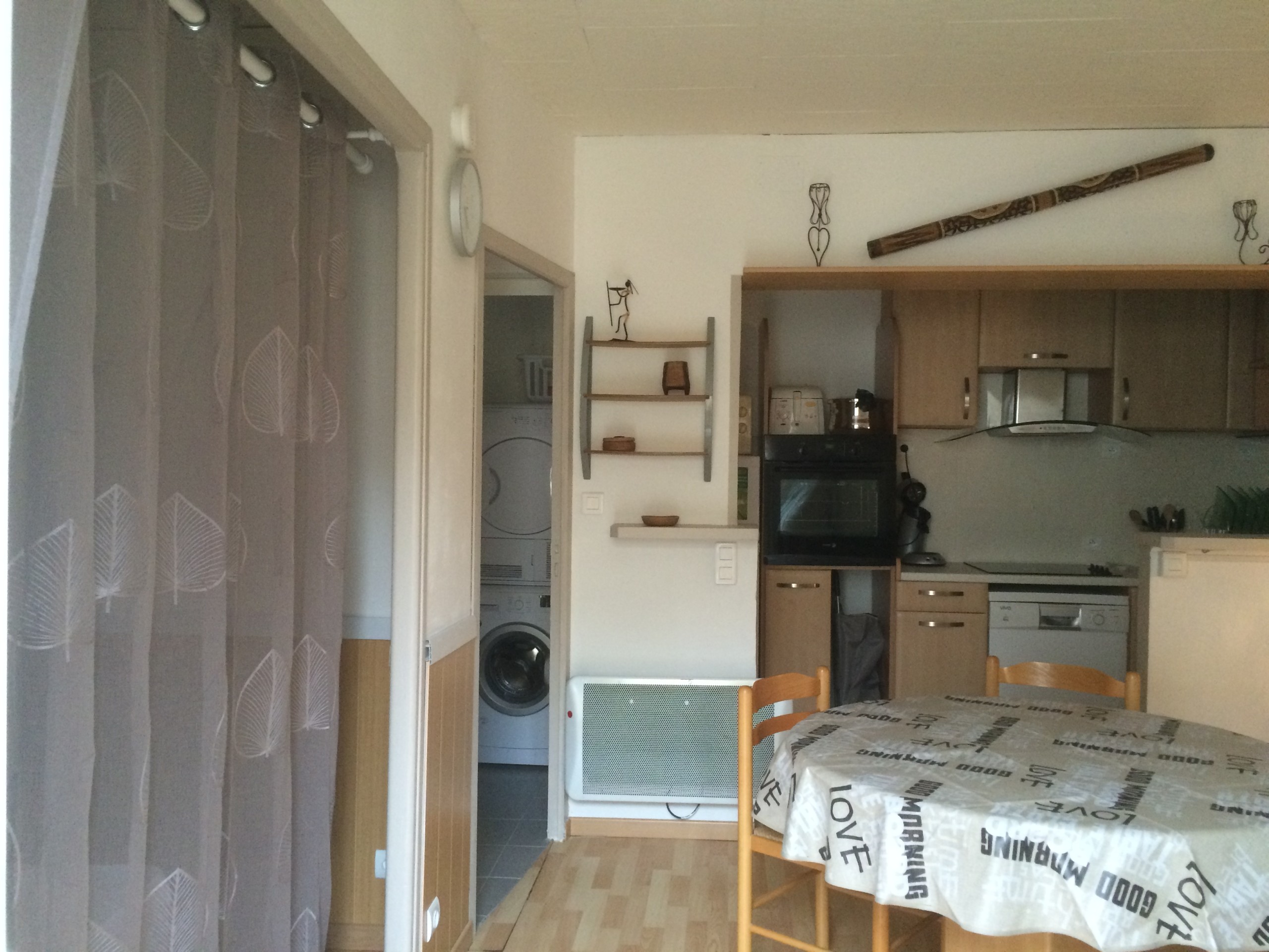 Il comprend une cuisine équipée, four encastré, four micro onde, plaque vitro, hotte aspirante, lave vaisselle, frigo + congélateur,