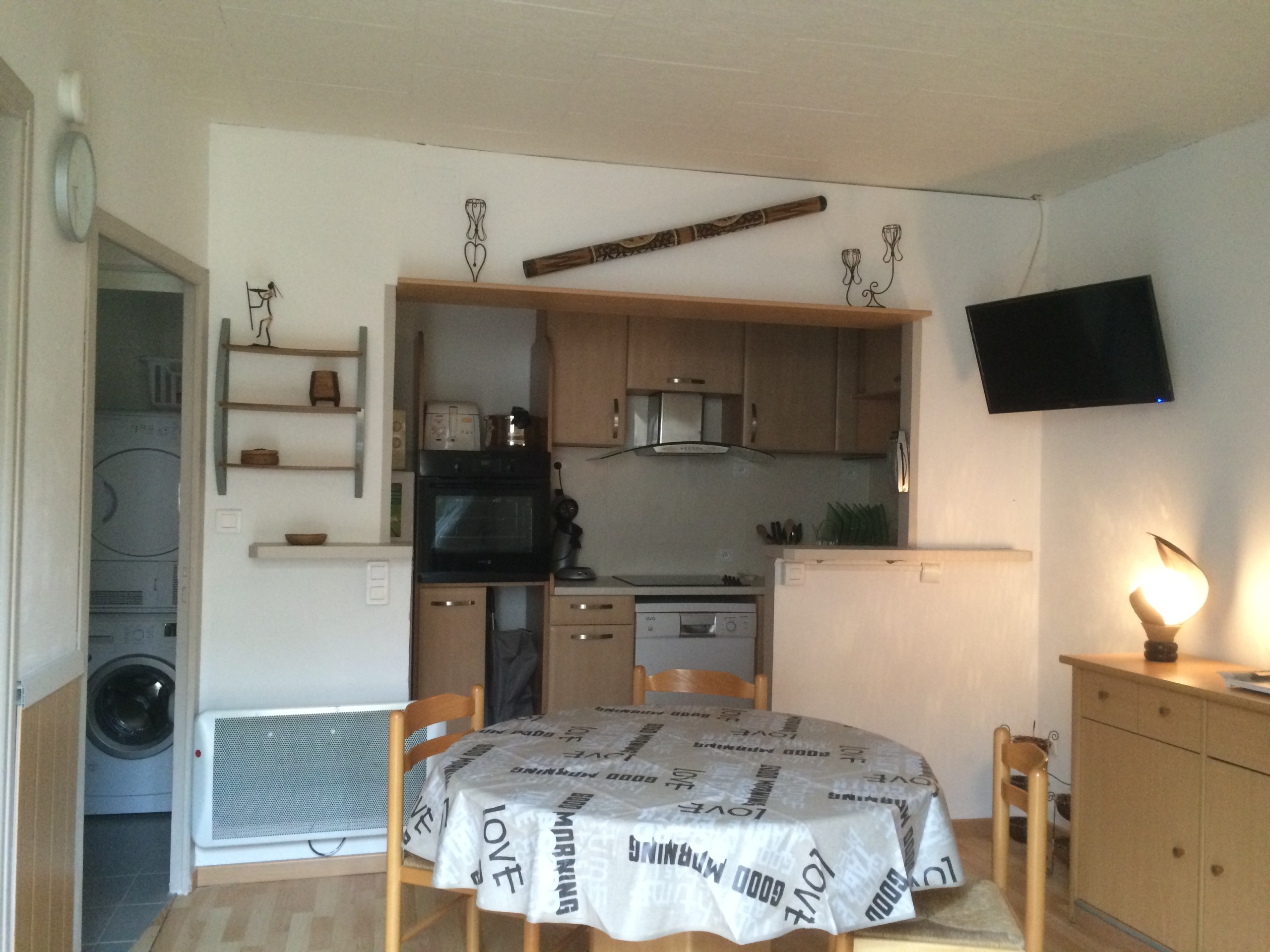 Salle de bain douche balnéo , sèche serviettes, meuble vasque avec miroir sèche cheveux, Coin wc Vous disposerez de toute vaisselle, ustensiles de cuisine, grille pain, bouilloire, cafetière Senséo et normale, mixeur, autocuiseur multifonction, friteuse etc etc…