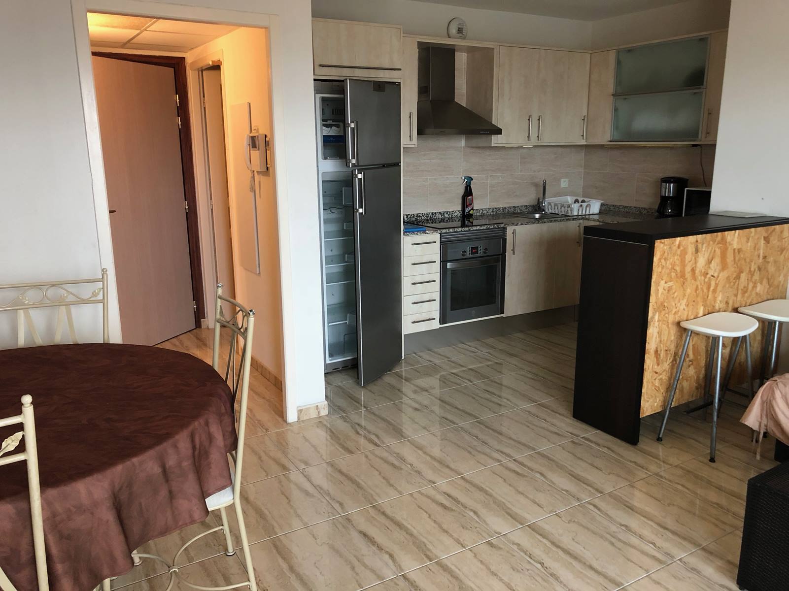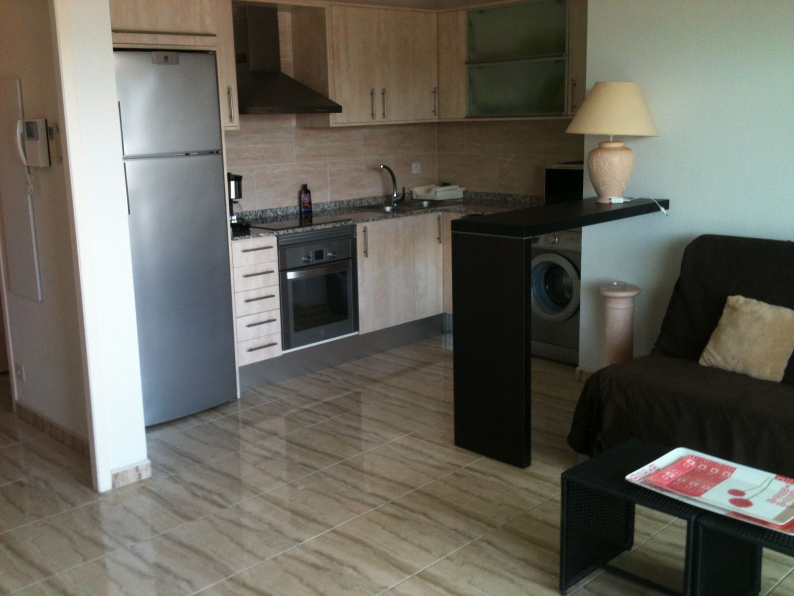 - Cuisine entièrement équipée : lave-vaisselle, lave-linge, four, micro-ondes, plan de travail finition marbre