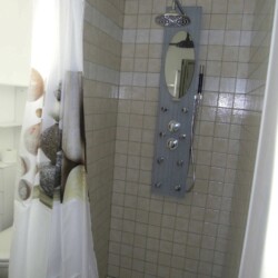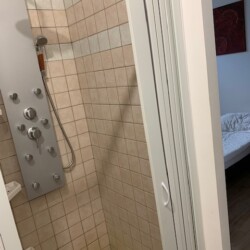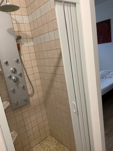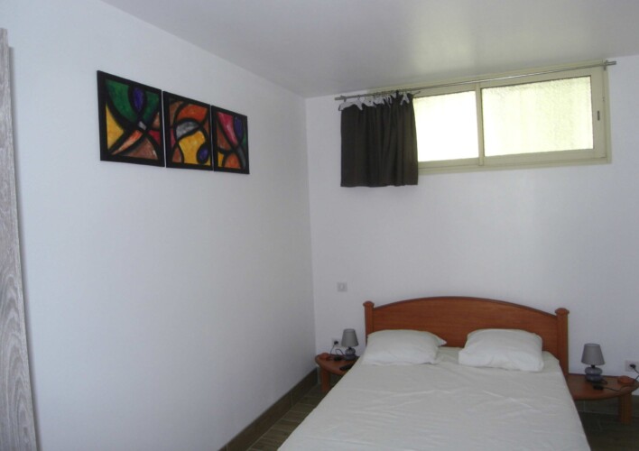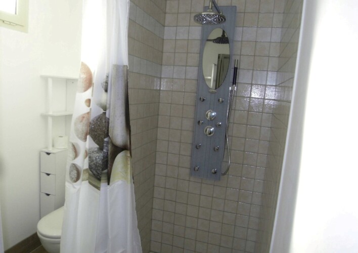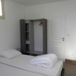 1 Chambre avec 1 lit en 140 ,téléviseur, 2 chevets et penderie de rangement, Salle de bain avec douche à l’italienne hydro massante + meuble avec miroir, toilettes.