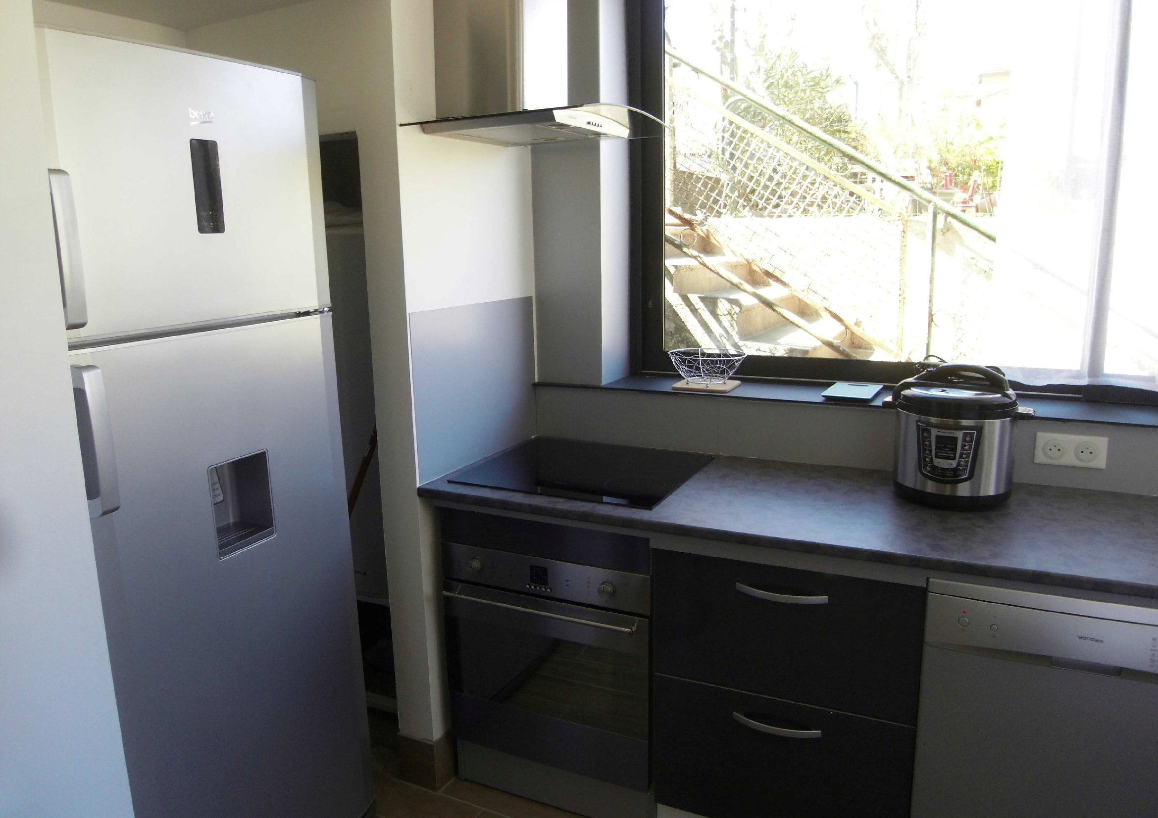 Une cuisine équipée, four encastré, four micro onde, plaque induction, hotte aspirante, lave vaisselle, frigo + congélateur.