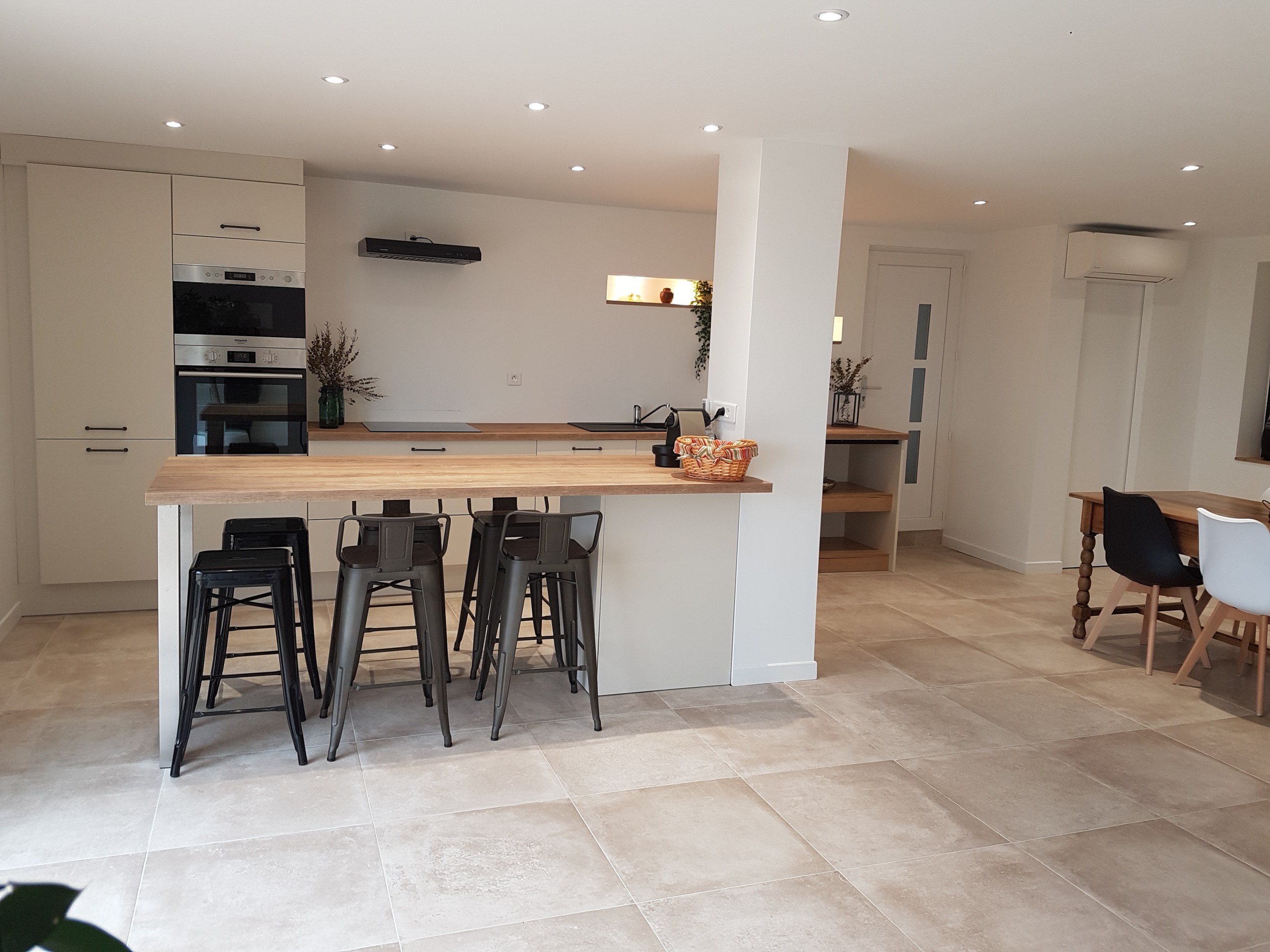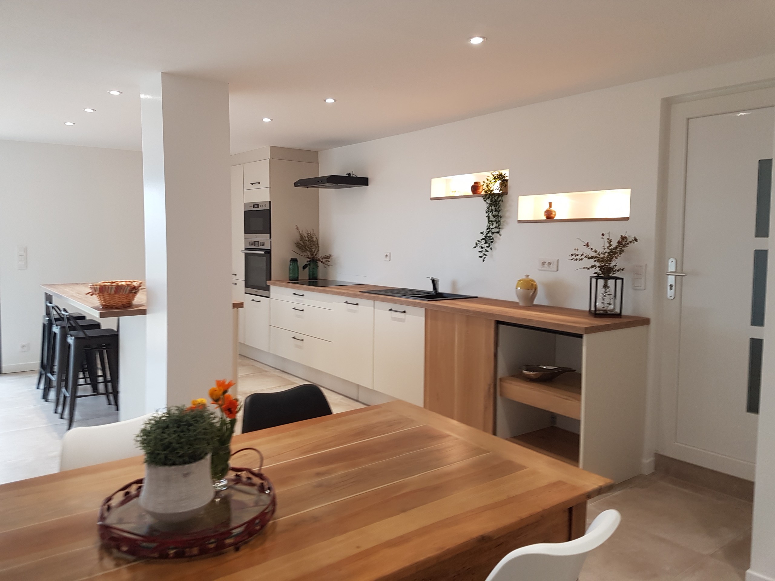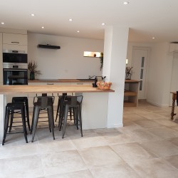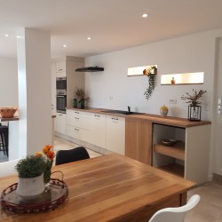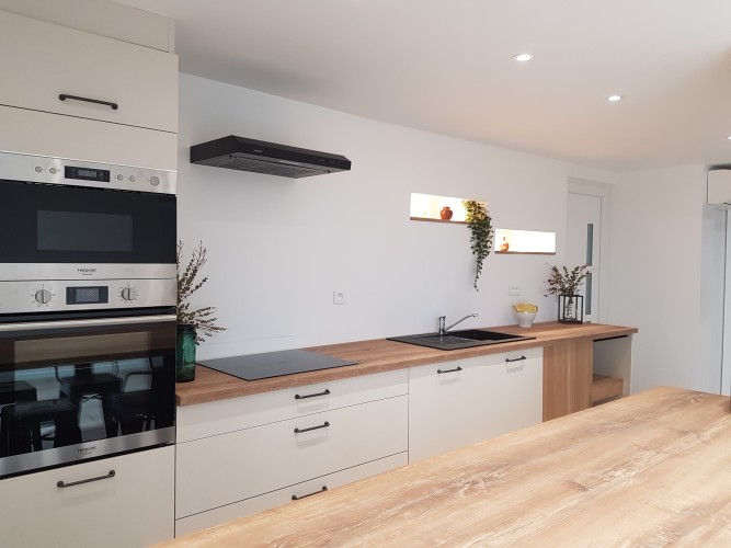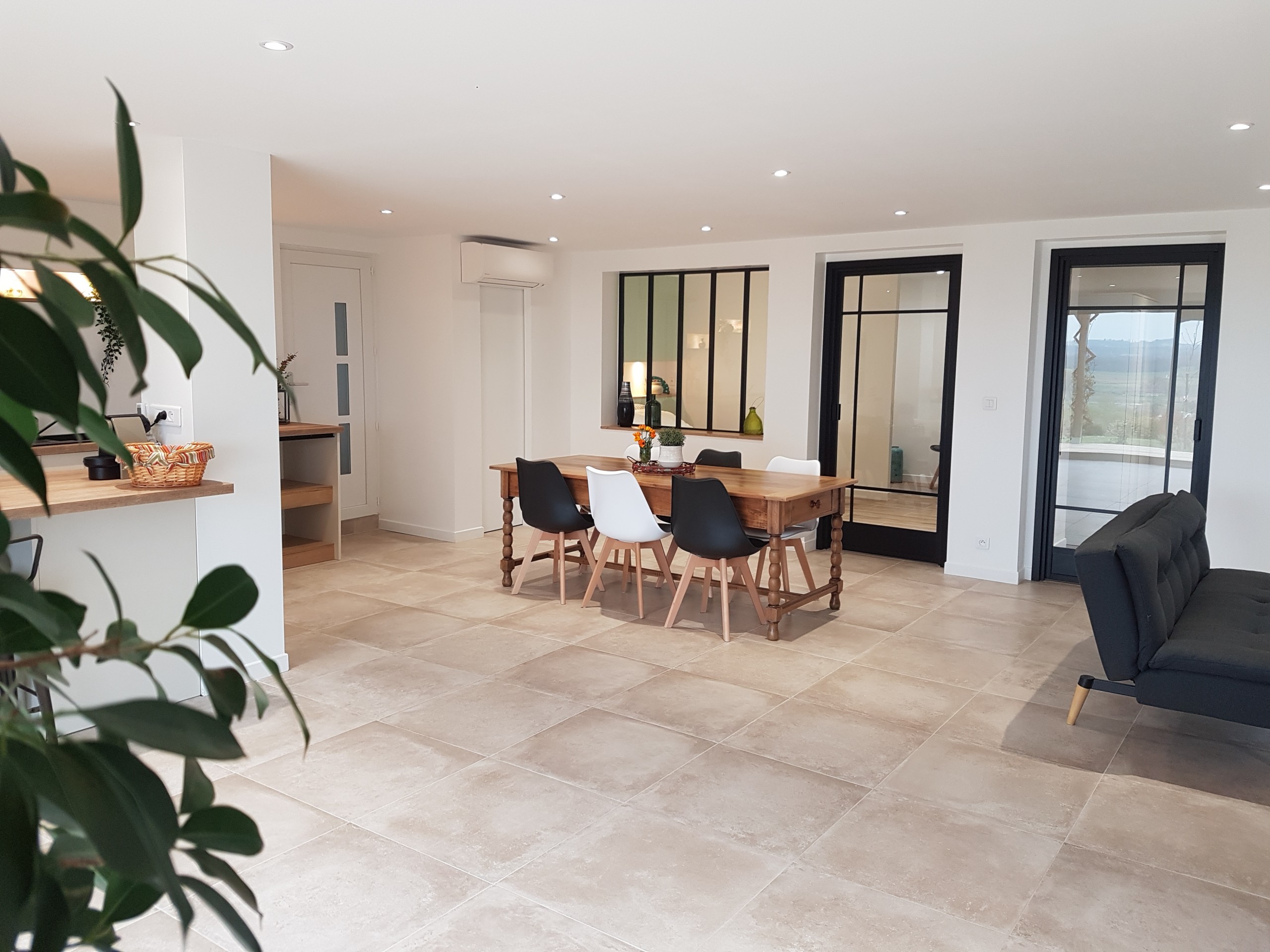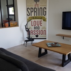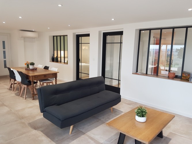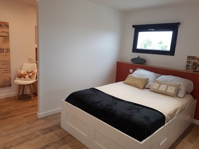 Son espace de vie se compose d’une grande pièce à vivre avec une cuisine équipée (réfrigérateur, congélateur, micro-ondes, plaque indiction, four, machine à laver, lave-vaisselle 12 couverts) ouverte sur séjour (table à manger, canapé convertible de 2 places).