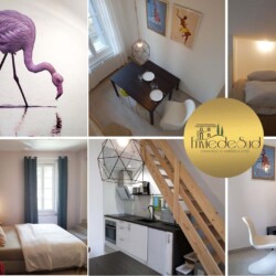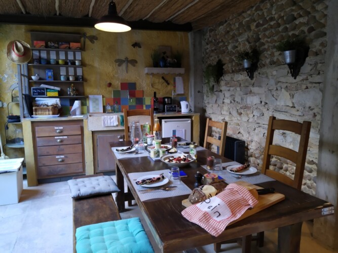 Notre gîte Flamants roses a sa entrée indépendante et son kitchenette et bien sûr une décoration unique – le design et l`art est une passion de votre hôtesse. Le gîte est au 1er étage et il y a une belle chambre et une mezzanine pour vos enfants dans la pièce qui fait séjour/ cuisine. Profitez de l’atmosphère particulière de notre maison, selon la saison, dans la cour intérieure verte et accueillante ou lisez un bon livre au coin de la cheminée dans la salle commune. Rafraîchissez-vous dans la piscine pendant les mois d’été. Le jardin et la piscine sont à disposition de toutes nos hôtes soit en gîte ou en chambre d’hôtes.