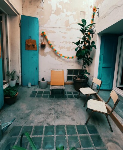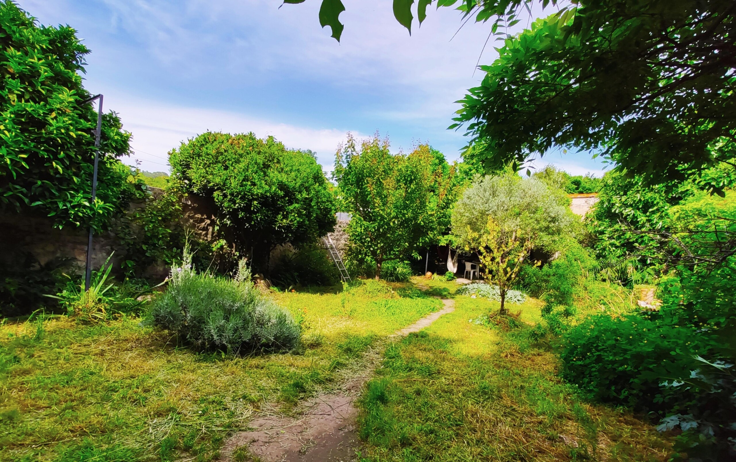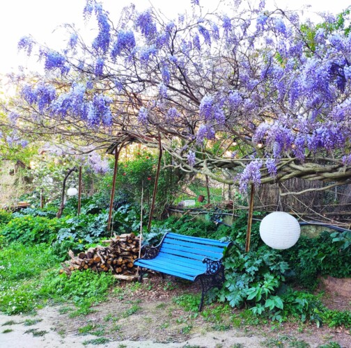 Tout au bout du couloir une porte en bois vous fera passer à l’extérieur par un premier petit jardin rattaché à la maison de notre voisine, puis passez le portillon bleu et vous serez arrivé dans notre jardin arboré et bordé d’une glycine géante.