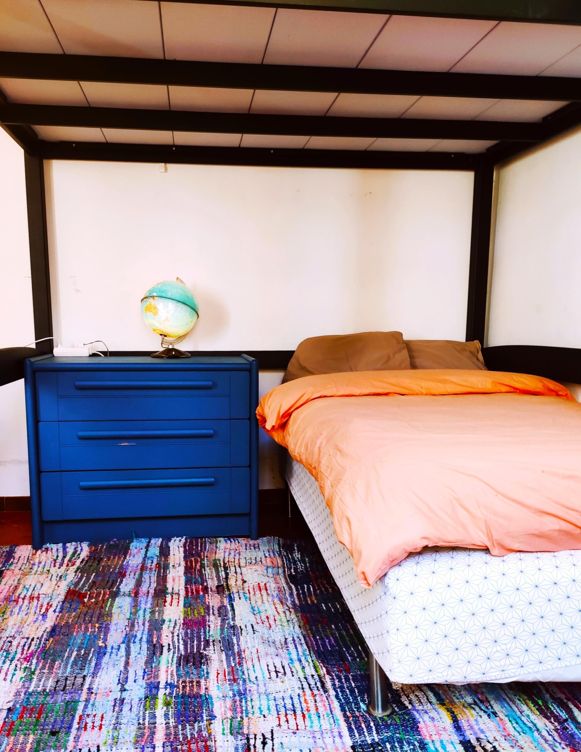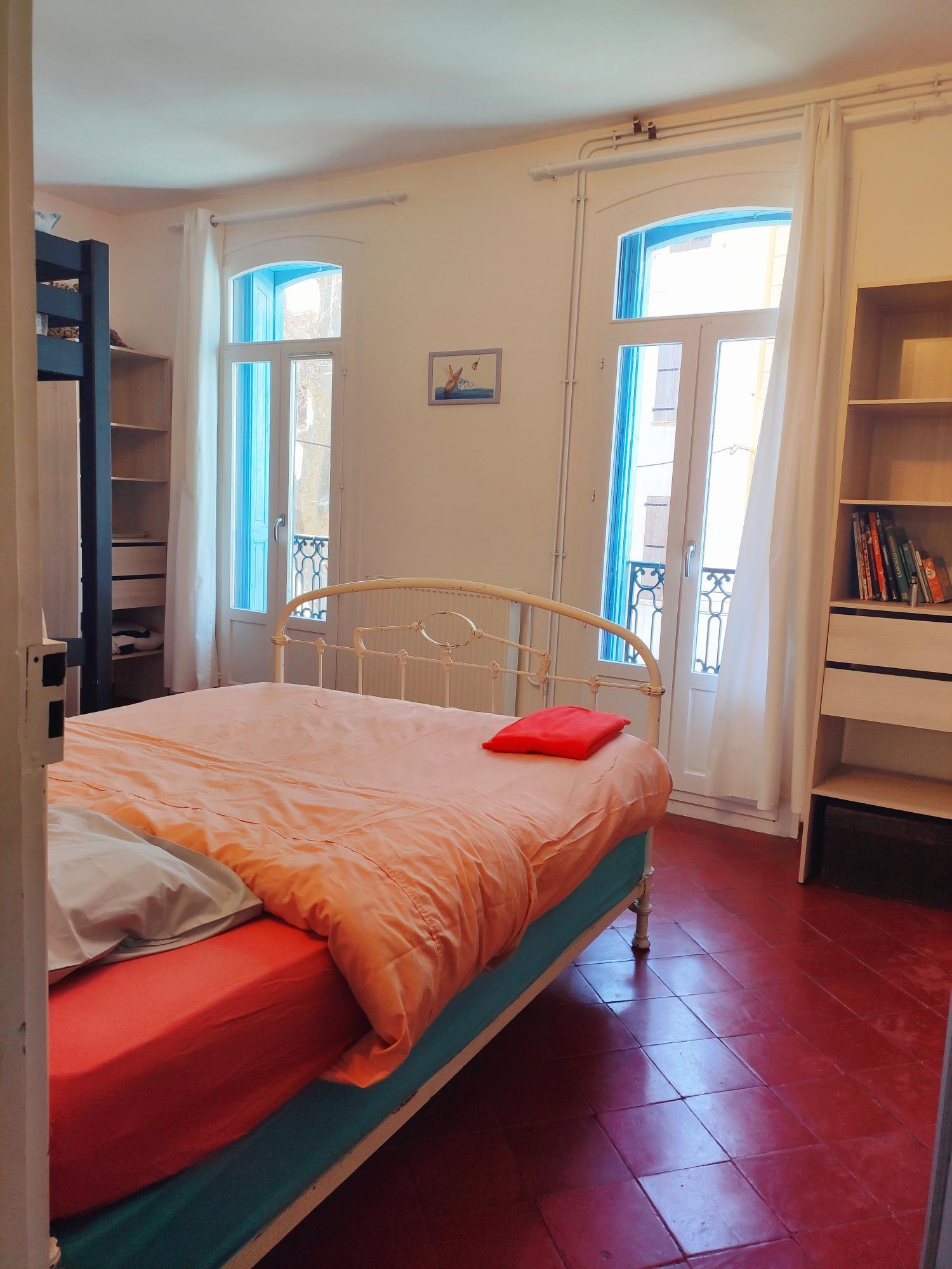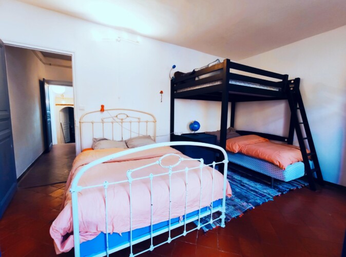 – Une chambre 4 places avec 1 lit simple, un couchage sur mezzanine et un lit double. Balcons donnant sur la rue.