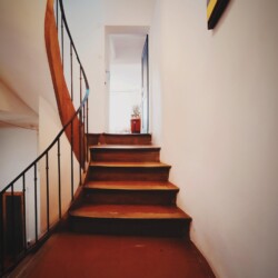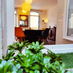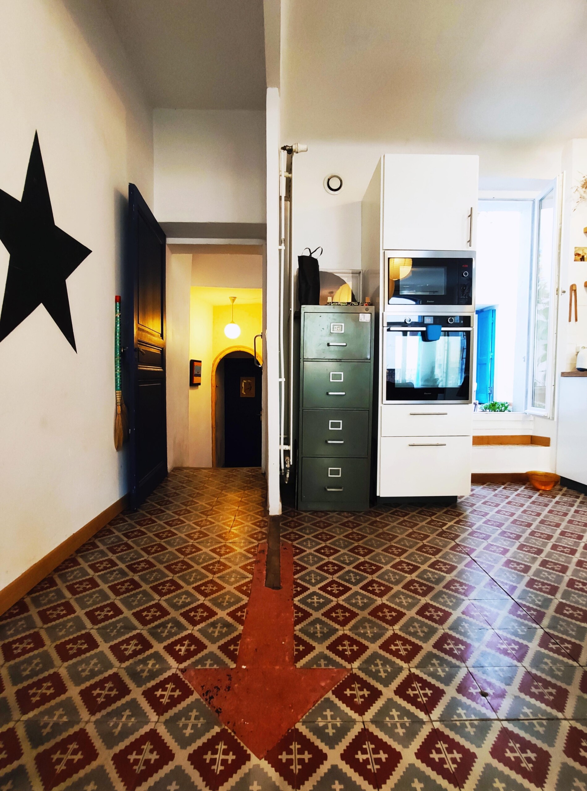 Au rez de chaussée, le couloir donnant d’un côté sur la rue et de l’autre sur les jardins. Il comporte 3 logements et une petite “buanderie” avec machine à laver (10 kg) et congélateur.