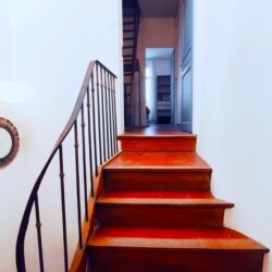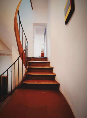 A l’entrée dans le logement, un grand escalier en colimaçon distribue les différents espaces de part et d’autre en niveaux décalés sur deux étages.