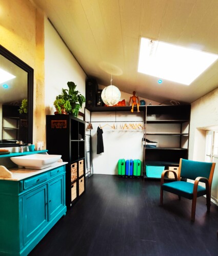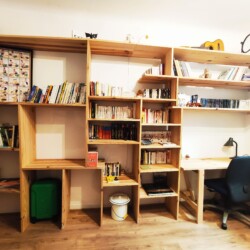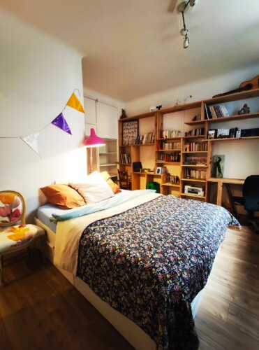 – une chambre “manga” lumineuse avec un coin bureau, lit queen size, dressing, cabinet de toilette et une grande bibliothèque remplie de livres divers et variés mis à disposition.