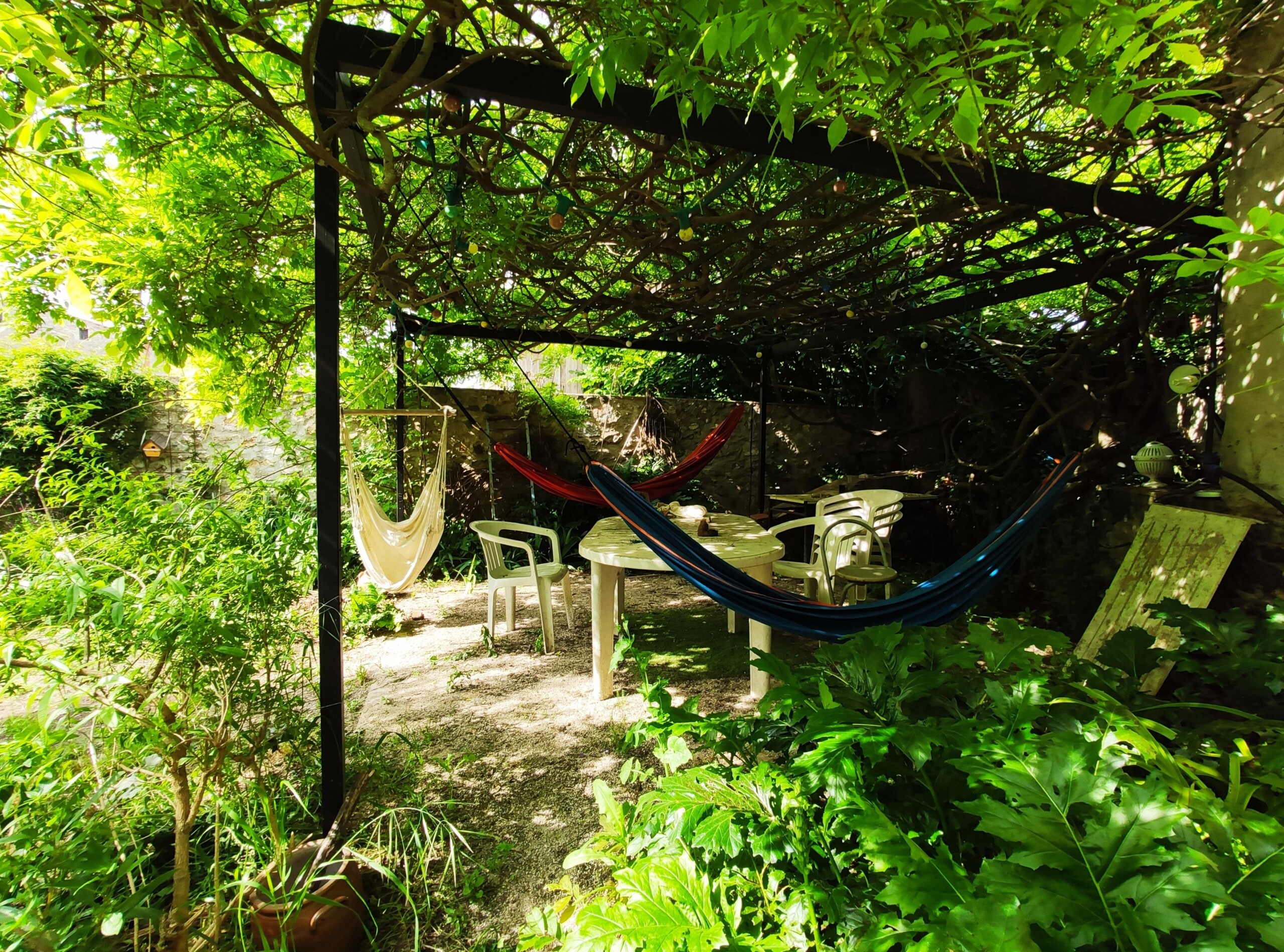 Tout au fond : pergola, hamacs et cuisine d’été vous attendent pour partager de beaux repas à l’ombre dans le salon végétal…