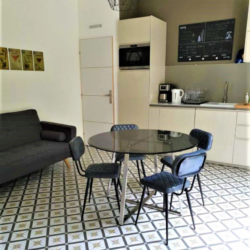 Le charme de l’ancien et le confort moderne dans le respect des matériaux : peinture et isolation bio, rampe d’escalier en fer forgé, mur en pierres et poutres apparentes, sol façon carreaux de ciment, cuisine entièrement équipée.