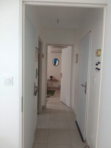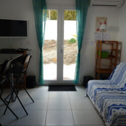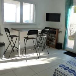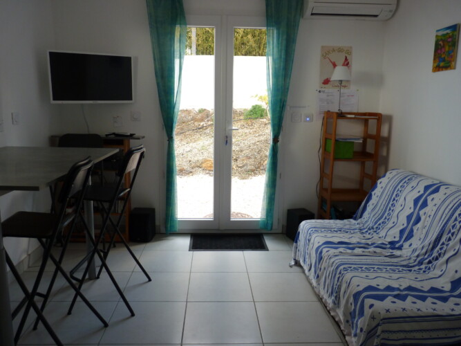 Dans la pièce à vivre il y a un convertible 2 places, une télé avec toutes les chaines free, un lecteur DVD et la wi-fi .