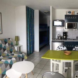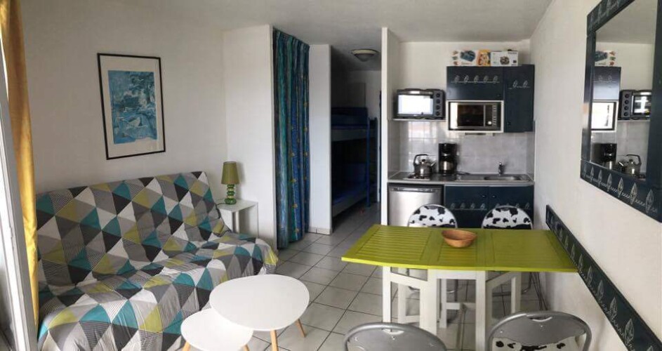A 40 mètres de la mer, accès direct plage sans route à traverser. Coin cabine de 2 lits superposés, canapé lit clic clac. Balcon de 6 m2